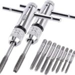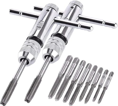 Thecomのネジタップドリルタップセットは、タップホルダーやT型ハンドルを含む2セットで、M3からM8までのねじ切りに対応。穴あけ作業に最適な工具です。