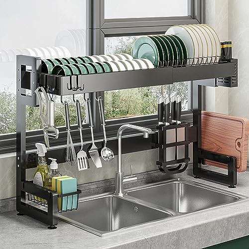 SVOHZAVの水切りラックは、シンク上に設置可能な2段式で大容量。錆びない素材で、皿立てや包丁スタンド、まな板立てとしても使用できます。組み立て簡単で、水が流れる設計です。(ブラック, 蓋付−長さ75cm)