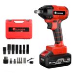 充電式インパクトレンチ、21V・4000mAhバッテリー。最大トルク320N·m、ブラシレスモーター、無断変速・自動停止機能、逆転切替、LEDライト付き。6本のソケット標準装備。軽量で強力、タイヤ交換や車の修理に最適。