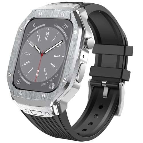LIRUWECHのApple Watchバンドは、45mm/44mmに対応する3in1一体型デザイン。Series 9/SE/8/7/6/5/4に適合、シルバーケースとブラックベルトの組み合わせで、スタイリッシュな mens アクセサリーです。