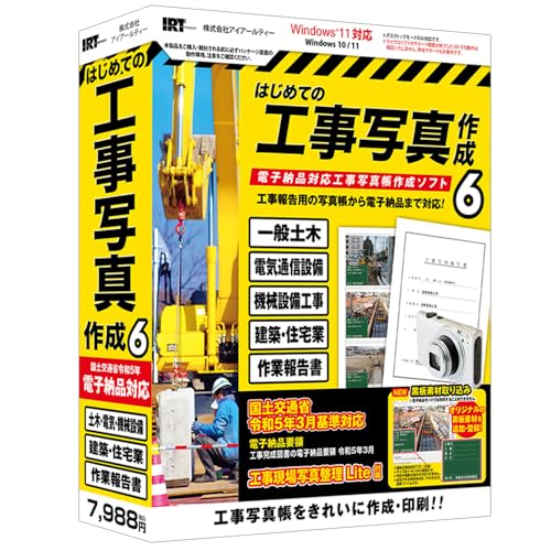 はじめての工事写真作成6は、工事現場の写真を簡単に整理・管理するためのソフトウェアです。高品質な写真編集機能や現場レポート作成といった便利なツールを搭載し、効率的な業務をサポートします。