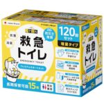 PYKES PEAKの救急トイレは、120回分の凝固剤と共通袋付きで、手袋も120個含まれています。15年保存可能で、災害時に役立つ防災グッズです。防災チェックリストも付属しています。