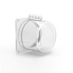 スイッチカバーロックアウトデバイス(丸型)は、内寸φ75xH65.5mmの透明PC製で、両面テープと設置用ネジ5本が付属。重さは約85gです。