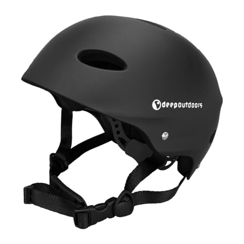 ディープアウトドアのウォータースポーツヘルメットは、CEマーク認証済みで安全性が高い。色はブラックで、耳ガードなしのLサイズ。水上活動に最適なデザイン。
