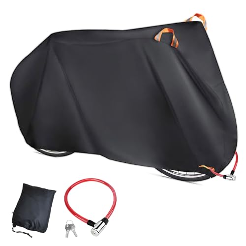 XINZY自転車カバーは600D厚手で防水、UV加工済み。雨や汚れから守り、破れにくい設計。二重縫製で丈夫、鍵穴付き、反射ストライプ、調整型防風バックル。約29インチ対応、収納袋付き。サイズ: 200cm*70cm*110cm。