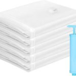 VECELO圧縮袋はポンプ付きで、多機能な防湿・防塵・防虫仕様。衣類、布団、クッションの圧縮に最適。旅行や引越しの整理整頓に便利な5枚セット、幅70x高さ145cm。