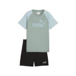 68786830_ESS NO.1 ロゴ ポリ Tシャツとショーツセット B_グリーン ムーン_130は、軽量で通気性に優れたポリエステル素材を使用した快適なウェアです。デザインはシンプルでスタイリッシュ。