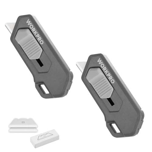 WORKPROのダンボールカッター2本セットは、自動引き込み式のミニカッターで、マグネット付き。キーホルダー穴があり携帯便利です。セラミック替刃2枚付きで、封筒や段ボールの開梱に最適です。