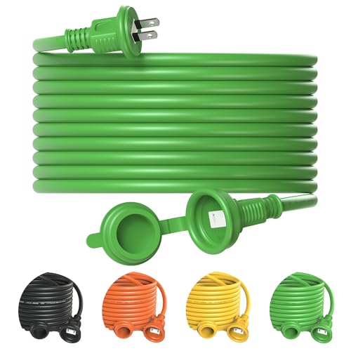 10mの防雨型ソフト延長コード。耐圧600V、PSE認証済みで屋外使用に最適。防水設計、トラッキング防止機能付き、キャンプやイルミネーションに対応。2芯タイプ。