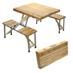 Waku fimac アウトドアテーブルは、72×85cmのサイズで、4人掛けの木製キャンプテーブルです。アルミフレーム採用の折りたたみ式で、コンパクトに収納可能。チェア一体型でパラソル対応。