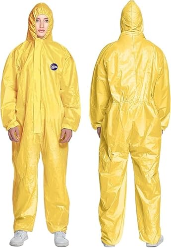 AXEL Hazmat Suits使い捨て5枚パック・フード付きイエロー保護つなぎ服。化学的保護で、男女兼用の通気性・防水性あり。サイズXL。