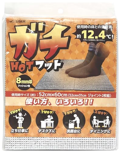 保温シート「ガチHOT フット!」は2枚組で、滑り止め加工が施されています。立ち仕事やデスク下、洗面台、ダイニングに最適。節電効果と防音機能もあり、快適な作業環境をサポートします。