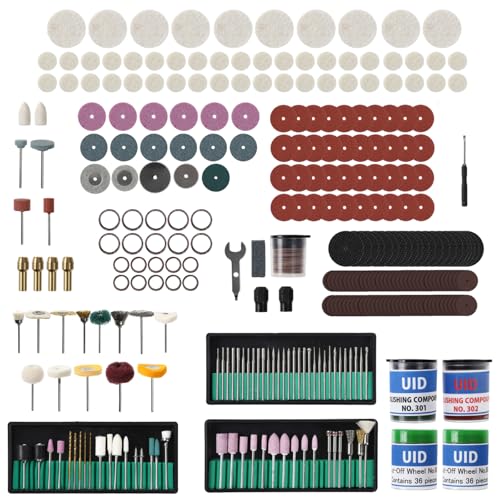 UIDミニルーター用ビットセットは、303個セットで51種類のビットを含み、2.35㎜軸とチャックが備わっています。ドレメルやプロクソンと互換性があり、コレットキャップ付きです。