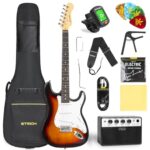 STRICHエレキギター初心者セットは、フルサイズSTタイプで39インチ、SSSピックアップ配列。ポプラ材使用、サンバースト色。ミニアンプ、専用ケース、チューナーなどのアクセサリー付き。