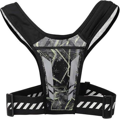ランニングベストは、携帯スマホホルダー付きで、ウォーターボトルやエナジーゼリーの収納が可能。軽量で男女共用、夜光反射と防水機能を備えた便利なアイテムです。色は鮮やかな黄色です。