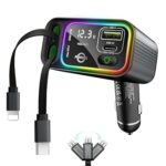 PDMAX 107W 車充電器は4つのデバイスを同時に急速充電可能。巻き取り式のUSB-C&Lightningケーブル、レインボーLEDライト搭載。DC12/24V対応、iPhone 17 ProやiPadなどに適合します。