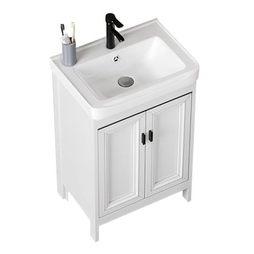 洗面化粧台セット、陶器製洗面ボウルと自立型キャビネット。開き戸式で収納力抜群。温水・冷水栓、排水金具付き。サイズ51x36x81cm、バルコニーや洗面所に最適なおしゃれなシンクです。