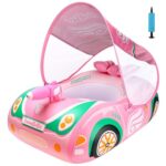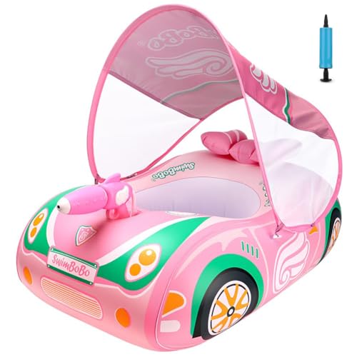 ベビー浮き輪はスーパースポーツカー型で、赤ちゃん用の足入れ浮き輪です。UVカットSPF50+の日焼け止め、取り外し可能なサンシェード付き。水遊びに最適で、12-48ヶ月向け (ピンク1)。