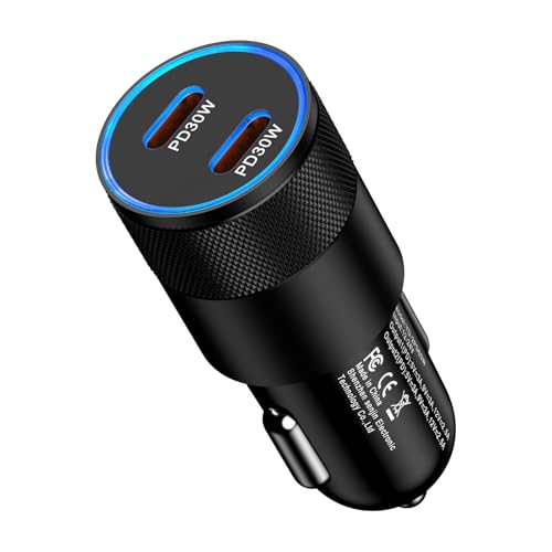 60W PD対応のシガーソケットUSB-C車載充電器。急速充電可能な2ポート設計。アルミニウム合金製で超小型。12V/24V対応。iPhone 17シリーズやAndroid機種も対応。