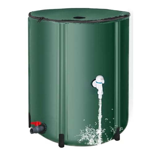 家庭用の大型貯水タンク、折りたたみ式で1000Lの大容量。雨水収集や洗車、水やりに最適。蛇口付きで簡単設置、緊急時の給水や防災にも対応。濃い緑色のガーデンコンテナ。