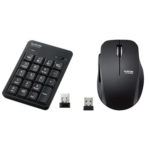 エレコムのUSBテンキー(TK-TDM022SKBK)はワイヤレスで静音設計、抗菌仕様。Windows/Chrome OS/macOS対応。また、Mサイズ5ボタンの静音ワイヤレスマウス(M-FBL01DBXSBK)もセットで使いやすい。