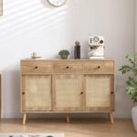 OSJキャビネットは、ラタン風デザインの収納棚で、引き出し付きの大容量収納が魅力。リビングに最適な2段の扉付きローボードとして、洋服やリネン整理に役立つ北欧風のナチュラルな木目調です。