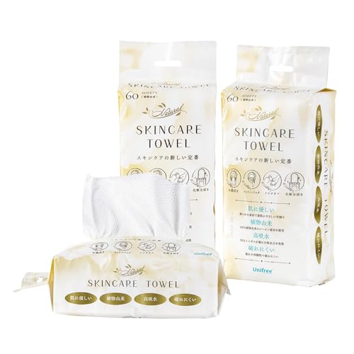 UNIFREEのナチュラルスキンケアタオルは、60枚入りの使い捨て顔拭きシート。フェイシャルタオルとして使えるペーパータオル。3袋セットで合計180枚。肌に優しく、手軽なスキンケアに最適!