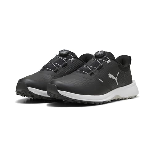 プーマのゴルフシューズ、フュージョングリップ6ディスクは、プーマブラック/アッシュグレーの配色で、29.0 cmサイズ。優れたグリップ力と快適なフィット感を提供し、ゴルフプレーをサポートします。