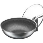 Kziazoiのチタン合金フライパンは、油煙が出ず、厚型で深型の設計。ドイツ製ステンレス製で、すべてのストーブに対応。34cmのガラス蓋付きで、多用途に使えます。
