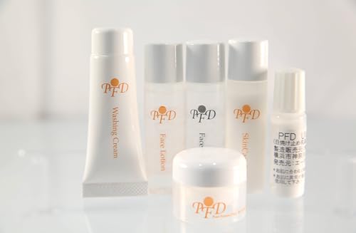 PFDのトライアルセットは、泡洗顔、化粧水、乳液、保湿クリーム、日焼け止めが含まれたポーチ入りで、3〜5日分の使用が可能です。旅行やお試しに最適なセットです。