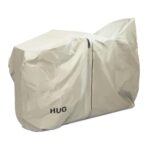HUG自転車カバーは、2024年新開発の厚手でしなやかな防水素材を使用。破れにくく、ハイバックチャイルドシート対応。サイドファスナー付きで便利。防風、UVカット、汚れ防止、盗難防止機能も備えたおしゃれなデザインです。