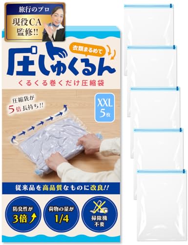 CA監修の旅行用圧縮袋XXLサイズ(5枚入り)は、大容量で衣類をすっきり整理。空気を抜くことでスペースを節約し、旅行や収納に最適です。耐久性のある素材使用で、繰り返し使用できます。