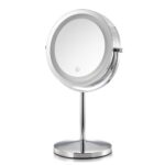 MotoM LEDライト付き卓上ミラースタンドは、調光・光色切替機能、3倍拡大鏡を備え、コードレスで軽量設計。直径17.5cmで便利な使用が可能です。