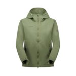 ハイキングに最適なマムートのウィンドブレーカー。軽量で撥水性があり、フーデッドデザインが特徴。アジアンフィットで女性にぴったりのフィット感。