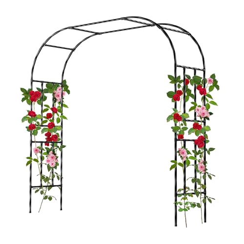 Caroeas バラアーチは金属製で、サイズは幅180×奥行40×高さ240cm。屋外用で錆びにくく、パイプ径20mm。組立簡単で、ガーデンアーチやトレリス、園芸装飾に最適なブラックのデザインです。