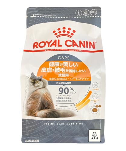 ロイヤルカナン 健康で美しい皮膚・被毛を維持したい成猫用キャットフード。毛艶と皮膚の健康をサポートし、オリジナルロゴステッカー付き。400gのパッケージ。