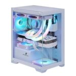 Micro-ATX、ITX対応のミドルタワーPCケース。静音・コンパクト設計、強化ガラスパネルのホワイトモデル。RGBファン対応、LEDライティング、優れたケーブルマネジメント、高エアフローでデスク下設置可能。