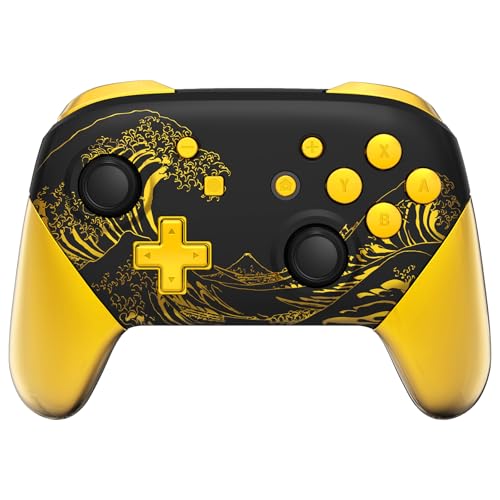 eXtremeRateのフェースプレートとバックプレートは、Switchプロコンに対応したDIY交換用グリップハウジングケースです。デザインは神奈川沖の金色の波をテーマにしたブラックです。