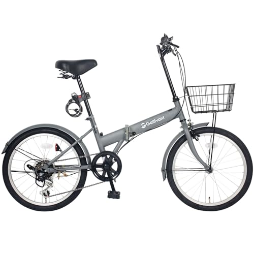Gallivant GV-06は20インチの折りたたみ自転車で、6段変速機能を搭載しています。前後に泥除けがあり、軽量でコンパクトなデザインが特徴です。カラーはマットグレーで、通勤や休日のレジャーに最適です。