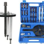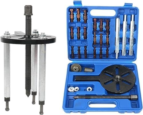 ベアリング分解プーラーセットは、3ジョー付きでホイールベアリングの取り外しに最適な自動車整備工具です。耐久性のあるブルーのデザインが特徴です。