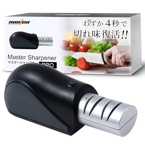 マスターシャープナー プロは、4回溝に通すだけで包丁の切れ味を簡単に戻すことができる電動式コードレスシャープナーです。手軽にナイフを研磨できるので、家庭での調理に最適です。