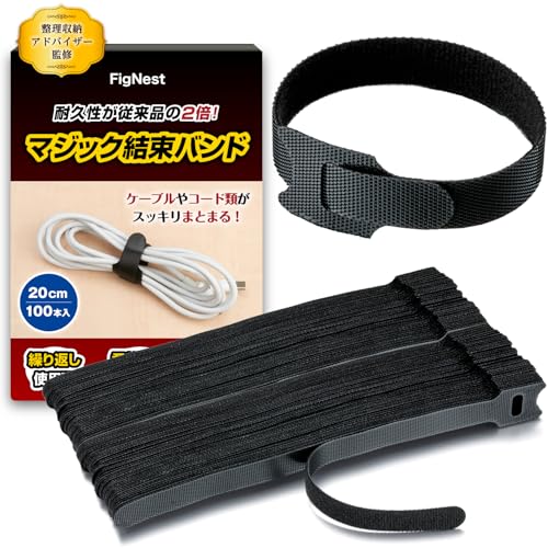 【整理収納士監修】結束バンドマジック付きテープは、耐久力2倍のコードまとめるケーブルバンドです。FigNest製で、サイズは100本入りの20cmです。