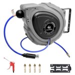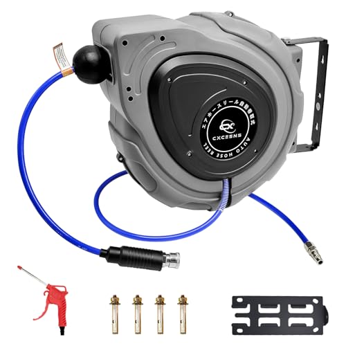 CXCESNS エアホースリールは、20mの長さで壁掛けおよび天吊り式、オート180°回転可能。自動巻取式で、引き込みが簡単。外径10mm、内径6.5mmのホースとブラケット付き。