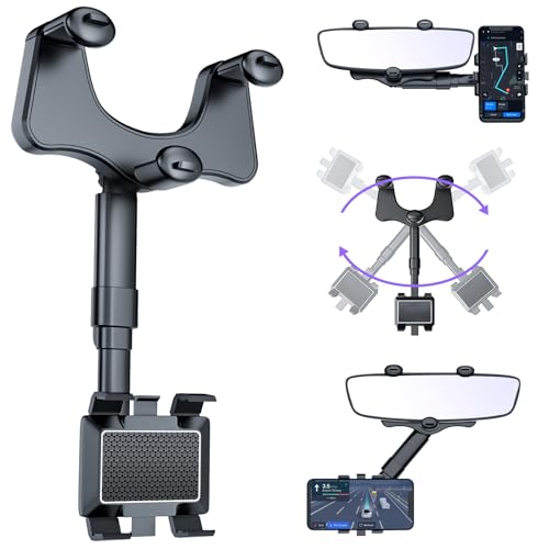 車のバックミラーに取り付け可能なスマートフォンスタンド。360°調整が可能で、すべてのスマートフォンに適合。運転中のナビや通話に便利な多機能設計。