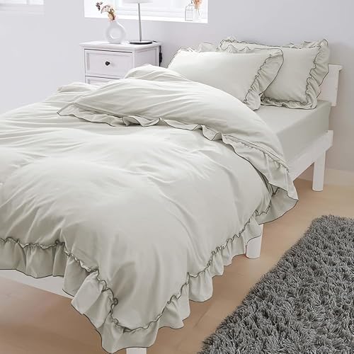 ベルーナのシングル3点セットは、かわいいフリルデザインの布団カバーです。吸汗性があり、光沢のあるピーチスキン素材を使用。ずれ防止機能付きで、掛布団カバー、ボックスシーツ、枕カバーが含まれています。
