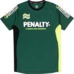 PENALTYのサッカー・フットサル用ハイスプラシャツ。半袖でストレッチ性に優れたデザイン。吸汗速乾機能付き。男女兼用、ダークグリーン色のLサイズ。