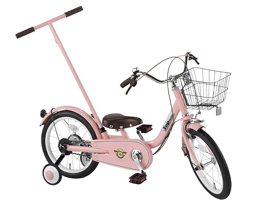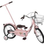 Topのいきなり自転車は16インチ、パステルピンクのデザインで、適応身長は93~120cm。補助輪付きで最長5年使用可能、かじとり式と押し手棒により安定性も抜群。
