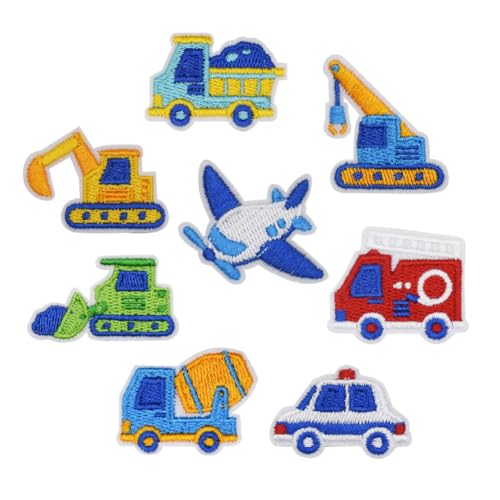 ワッペン アイロン不要の刺繍シール8枚セット。MUNCVYのアップリケで、ショベルカーをモチーフにしたデザイン。男の子・女の子向け、保育園や幼稚園の衣類、浴衣、手袋、手帳などの装飾や補修に最適です。