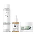 ANUAドクダミ3STEPセットは、77スージングトナー250ml、80モイスチャースージングアンプル30ml、70インテンスカーミングクリーム50mlを含むオールインワンのスキンケアセット。ゆらぎ肌やオイリー肌に最適で、水分保湿もサポート。