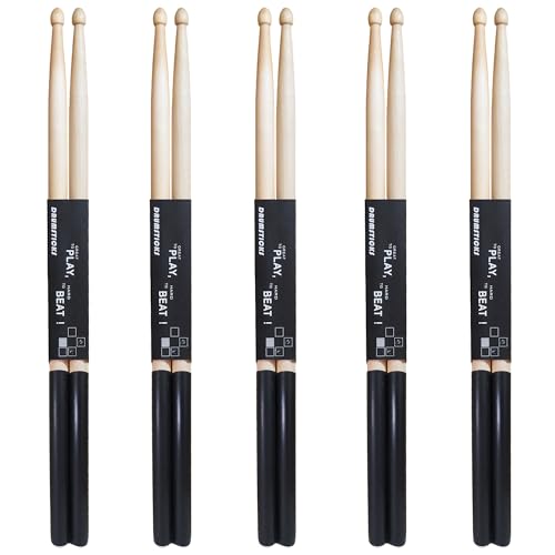 初心者向けドラムスティックセット。滑り止め付きの5Aサイズで、軽量メープル素材を使用。黒色の5組セットで、練習に最適です。
